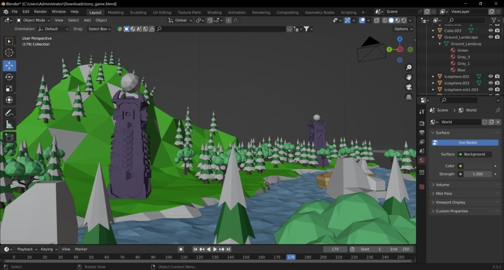Crucial to the process was the scene’s composition. I achieved a well-balanced and immersive atmosphere by manipulating the size and positioning of each object. For the purpose of player navigation and immersion, the placement of rocks, trees, and bodies of water was carefully considered.